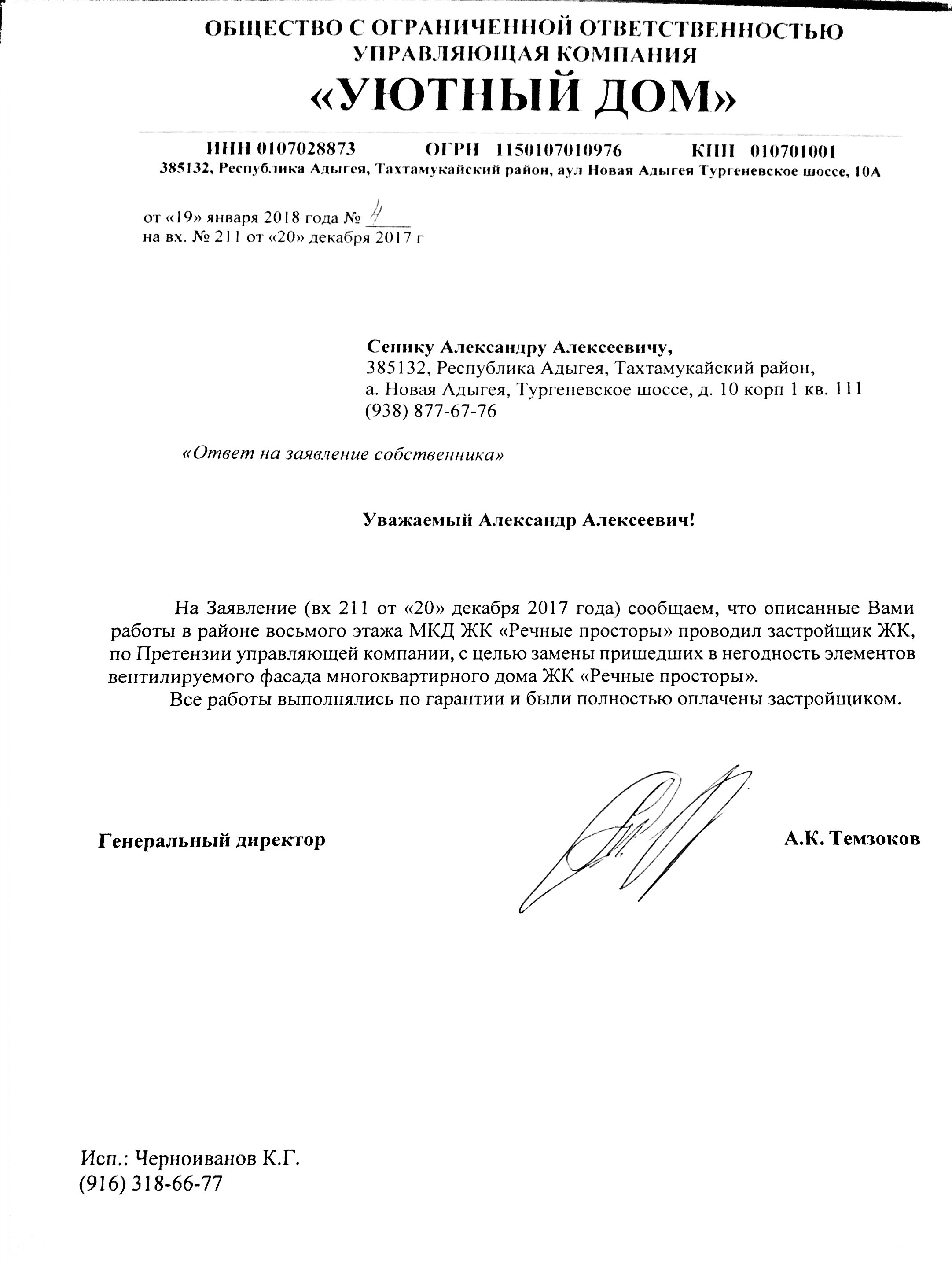 Так же многие из вас говорят, что УК наш прямой выход к застройщику (дом будет находиться на гарантии ещё три года) по всем страховым случаям, но что мы имеем по факту: застройщик ООО «Стройинвест» напрямую не работает с жалобами по обнаруженным дефектам. Отправляет всех писать претензии в УК, тем самым затягивая их решение и снятие с себя ответственности, потом просто скажут, что заявление потеряно, не дошло и т.д. и ничего никому вы не докажите.