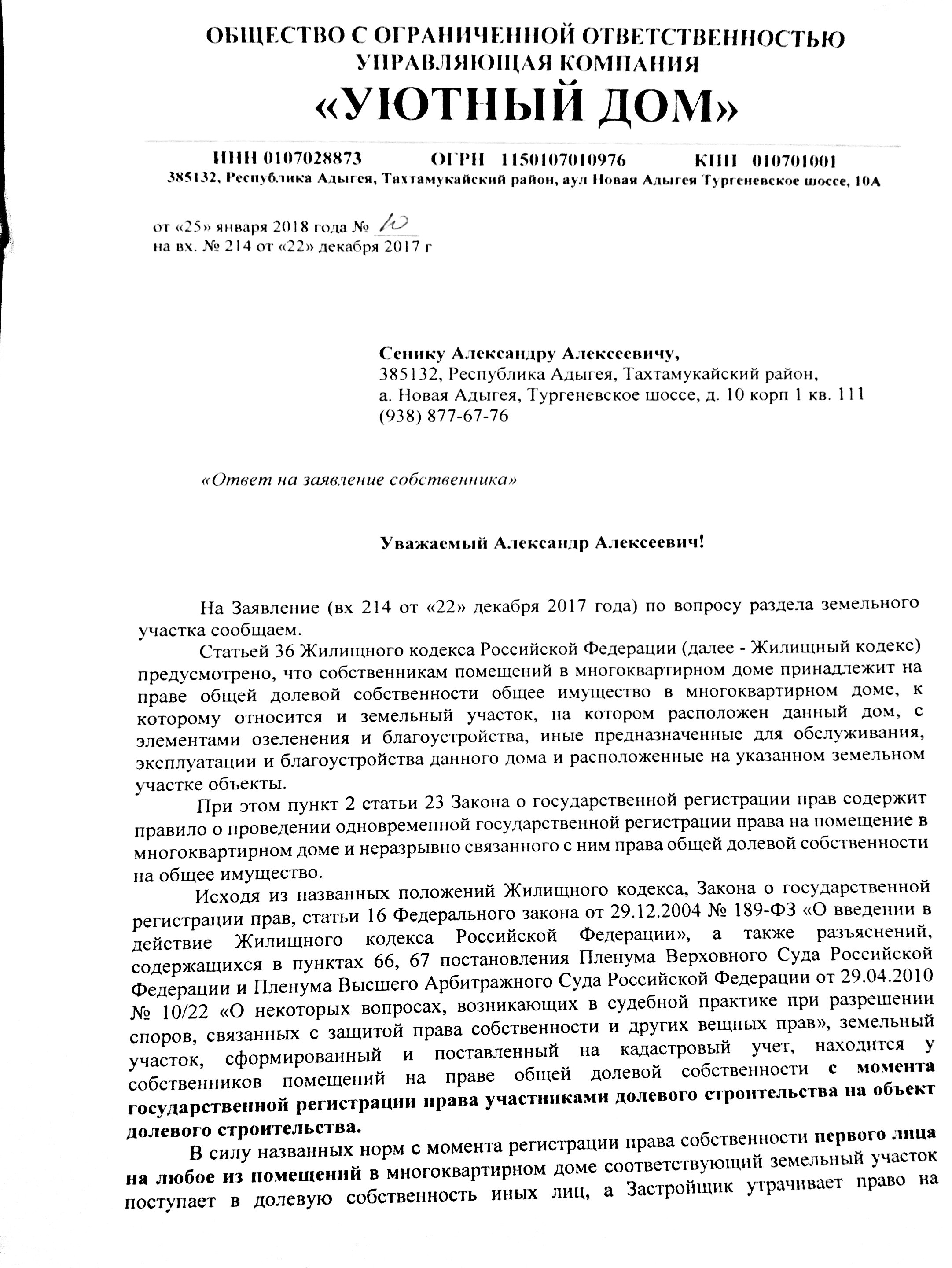 Вопрос по разделу участка остается открытым (на эту темы мы проведем отдельное собрание), ответ от УК: